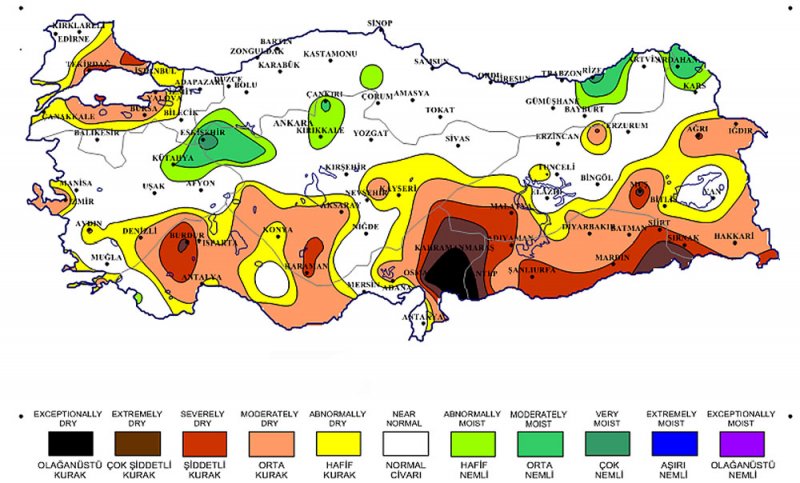 Cette carte de l’humidité du sol montre qu’une grande partie de la zone de culture de la Turquie connaît toujours une sécheresse modérée à exceptionnelle, y compris le sud-ouest où sont cultivées la plupart des principales cultures.