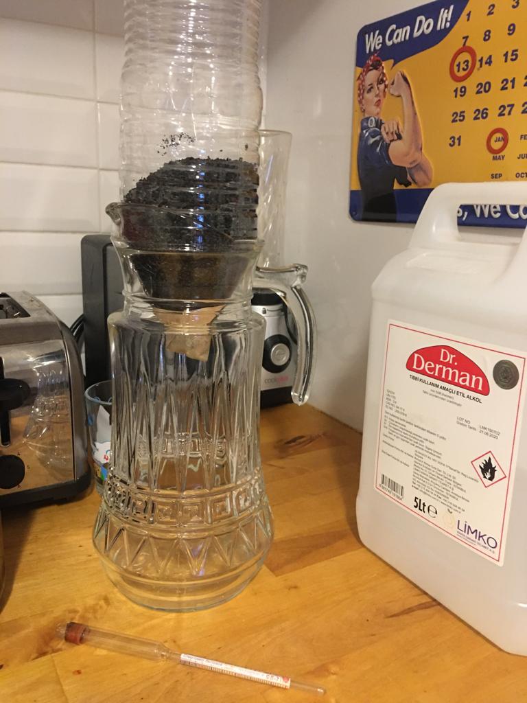 Utilisant désormais son propre alcoomètre, elle distille sa vodka à l’aide d’éthanol, de charbon, de filtres à café et d’une bouteille en plastique.
