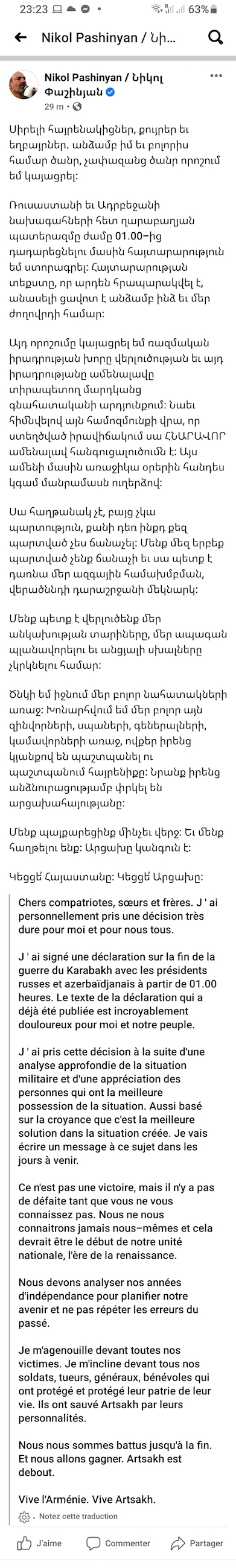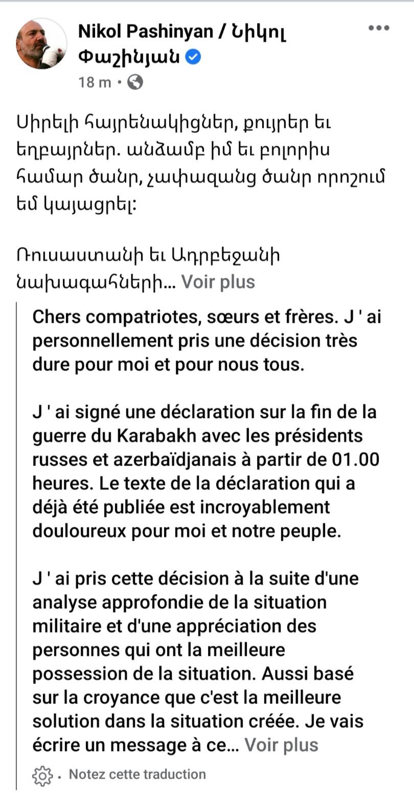 Actualité L’ARMENIE CAPITULE ! Publié le 9 novembre 2020 à 23h05min | par Engin | Nombre de visite 881 l’Arménie capitule La déclaration de capitulation se fera d’ici peu Selon nos sources, après 50 jours de combats, l’Arménie aillant perdu la plupart de son armée, acceptera de se retirer complètement et sans condition de Haut-Karabagh.