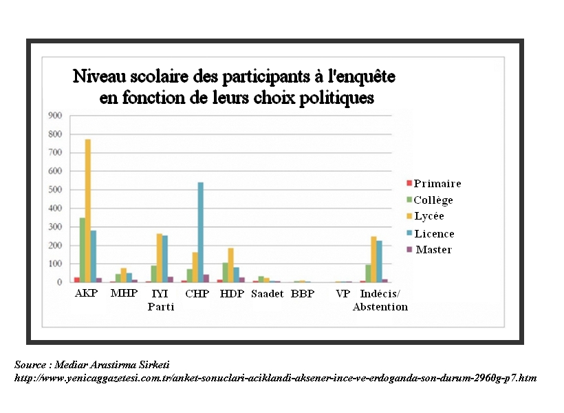 En effet d’après l’enquête de Mediar, les interrogés se disant favorables au CHP se composent très majoritairement de personnes ayant une licence alors que ceux qui se disent favorables à l’AKP ont majoritairement un diplôme équivalent au baccalauréat. IYI Parti quant à lui présente autant de personnes étant diplômées du lycée que de l’université, ce qui est un indice de jonction entre des électorats de classe moyenne et de classe supérieure.