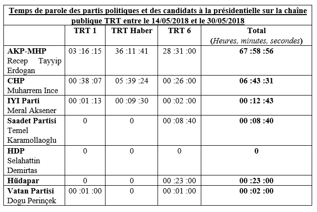 Outre la composition sociologique de la Turquie, notons, le non-respect d’un temps de parole égalitaire (principe démocratique permettant la pluralité électorale) notamment sur la chaîne d’Etat TRT (Radio-Télévision de Turquie). Comme suit les temps de parole de chaque parti :