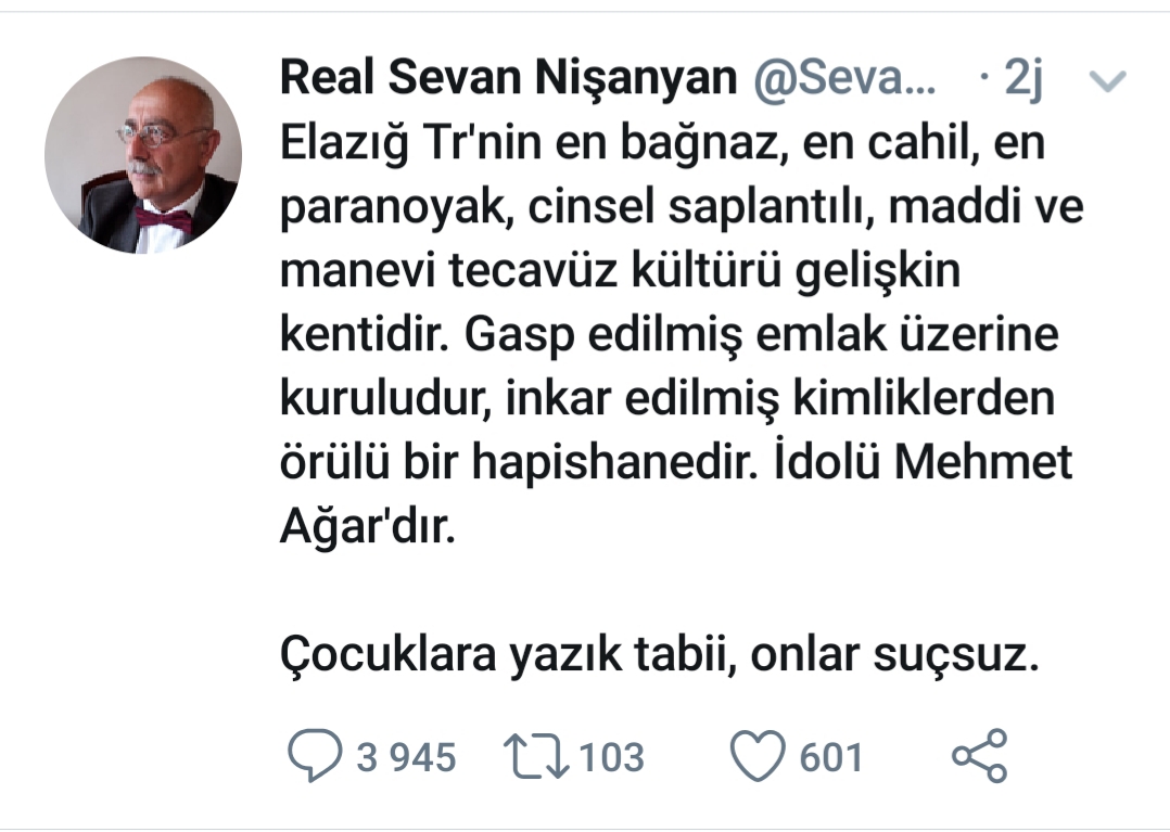 Un "intellectuel" turc d’origine arménienne a insulté les habitants de la ville sinistrée de Elazığ en Turquie, avec un tweet comportant insultes et propos racistes.